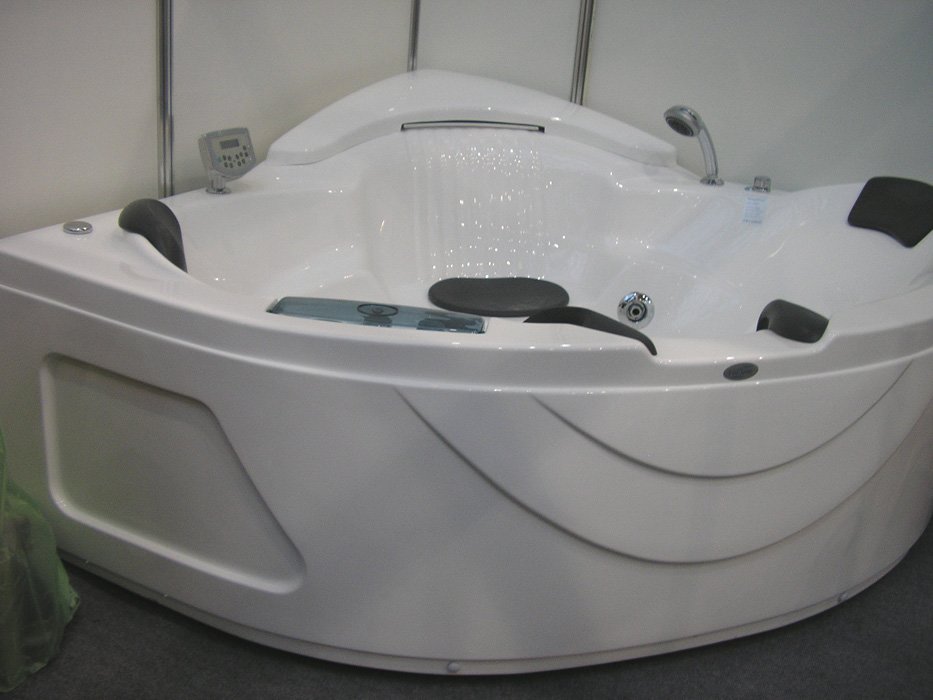Вторая ванна, представленная на стенде - VOLTEM M-2202. В каталоге несколько угловых моделей. Есть угловая ванна VOLTEM M-204 с мраморной декоративной накладкой на борту, есть модель VOLTEM M-B8005 со ступенькой. У этой ванны, как вы видите, есть встроенный каскадный излив, есть модель с изливом, установленным на борт ванны.
