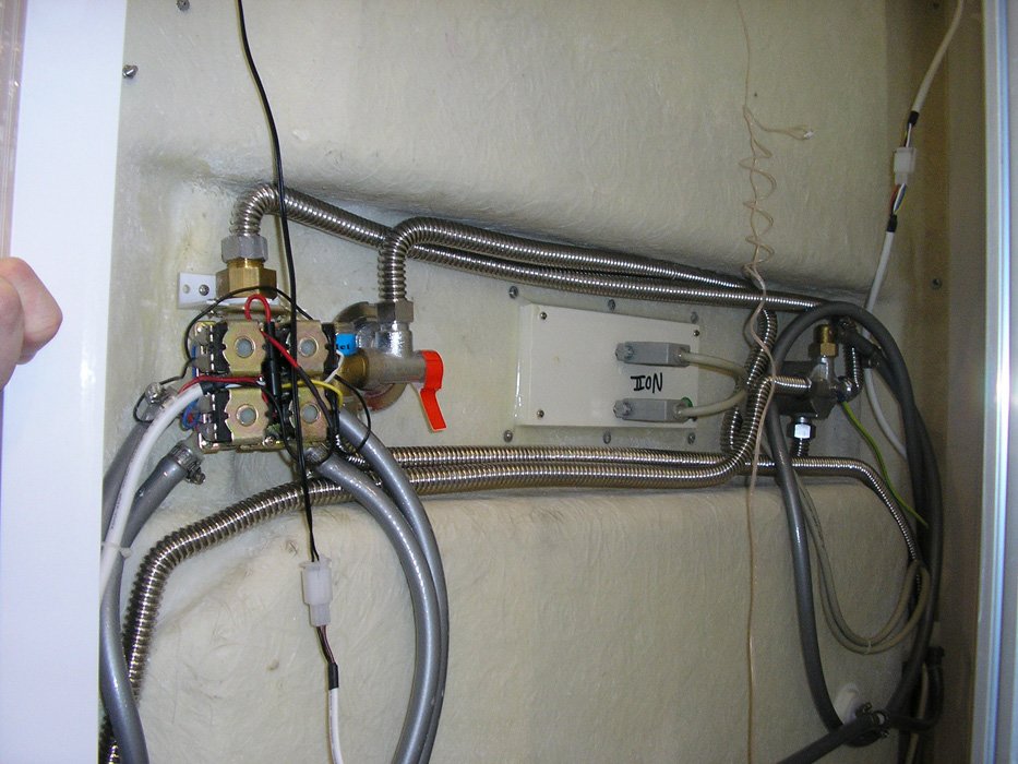 Отодвинув кабину от стены, мы можем видеть всю разводку. Все самое ценное сделано из нержавейки. Трехкиловатный парогенератор, большой электронный блок