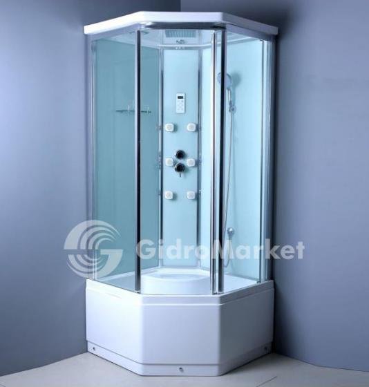 Душевая кабина c гидромассажем и высоким поддоном, стеклянными задними стенками и раздвижными дверцами.