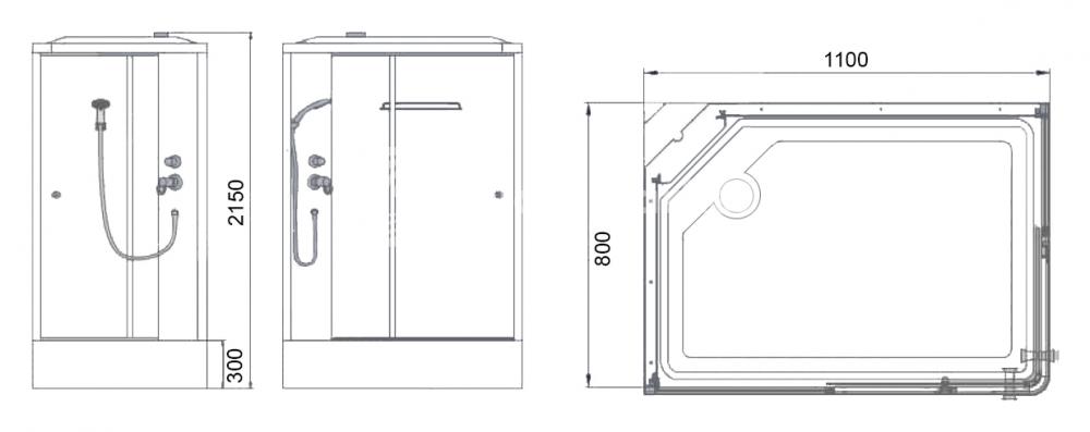 Испанская прямоугольная душевая кабина со средним поддоном (110х80 см) и раздвижными дверьми с прозразными стеклами.