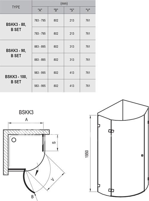 Изделие состоит из двух ровных неподвижных частей и одной изогнутой части, образующей двери поворотного типа. Устанавливается в облицованный кафелем угол ванной комнаты на поддоны RAVAK ELIPSO, ELIPSO PRO, ELIPSO PRO FLAT, ELIPSO PRO CHROME или непосредственно на пол со встроенным душевым каналом. Душевой уголок BSKK3 поставляется в составе: две стенки, одна дверь и планки - в одной упаковке. Во второй упаковке (B SET) находятся петли, крепления, ручки, монтажный набор и короткий держатель Brilliant (DBK). B SET необходимо докупать к изделию отдельно.