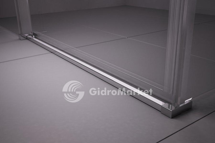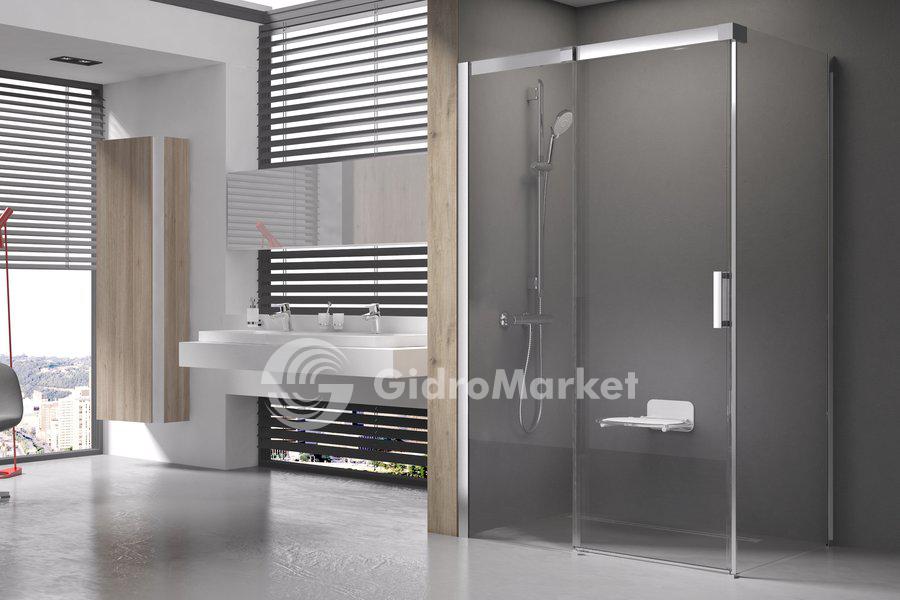 Роскошный раздвижной уголок, созданный с помощью комбинации душевых дверей и неподвижной стенки. Неповторимый дизайн с доминирующими массивными верхним и боковым профилями.