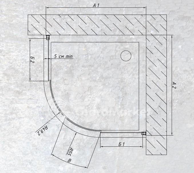Ограждение угловое полукруглое, двери - раздвижные две створки из центра.