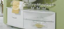 Вместительная угловая модель с раковиной из литого мрамора, которая комплектуется хромированным рейлингом – его можно использовать в качестве полотенцедержателя. В тумбе, устанавливаемой и передвигаемой на колесных опорах, за гнутоклееным фасадом расположена корзина для белья. Большое угловое зеркало состоит из двух частей и оснащено верхней панелью с декоративной подсветкой. Комплект выпускается в левом и правом исполнении в зависимости от расположении чаши.
