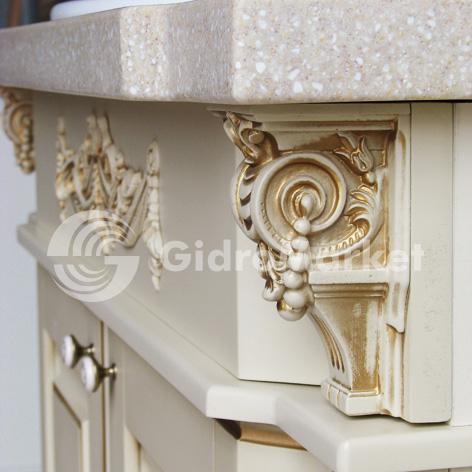 Декорированный фасад МДФ, покраска. Цвет "gold" (RAL 1015, патина золото). Производится по предварительному заказу, срок изготовления 30 дней. Столешница из искусственного камня. Раковина Devit. Встроенная подсветка.