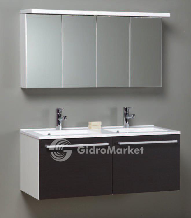 Комплект мебли для ванной с двойной раковиной и тумбой под раковину с выдвижными ящиками. Комплект может быть дополнен зеркальным шкафом и пеналом.
