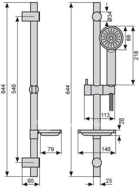 Душевой комплект: ручной душ, штанга из латуни Ø 25 мм, крепеж из ABS-пластика, полная длина 65 см.