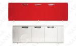 Тумба с фаянсовой раковиной и зеркалом по желанию клиента комплектуется пеналом, подвесным шкафом, а также экраном под ванну, выполненном в том же стиле что и мебель. Цвет венге с белым фасадом. Фасады выполнены из МДФ, а боковые части из влагостойкого ДСП. Петли оснащены доводчиками, ящики с шариковыми направляющими.
