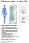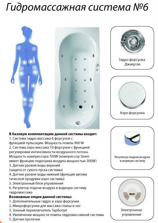 Гидромассаж - 6 форсунок, аэромассаж - 10 форсунок, спинной массаж - 6 форсунок, электронное управление, хромотерапия