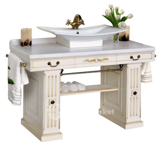 Тумба под раковину Atoll Прага, 785*1200*550 мм. Верхняя часть тумбы, своеобразный "фронтон", содержит два выдвижных ящика, отделанных изнутри искусственной кожей, а центральная декоративная панель украшена легкой гирляндой. Раковина в комплекте не идет.