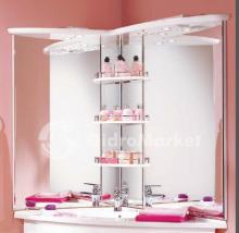К открытым полочкам на зеркале, добавлены хромированные рейлинги - ограничители. Большое зеркало состоит из двух частей и подсвечено светильниками, встроенными в верхнюю панель.